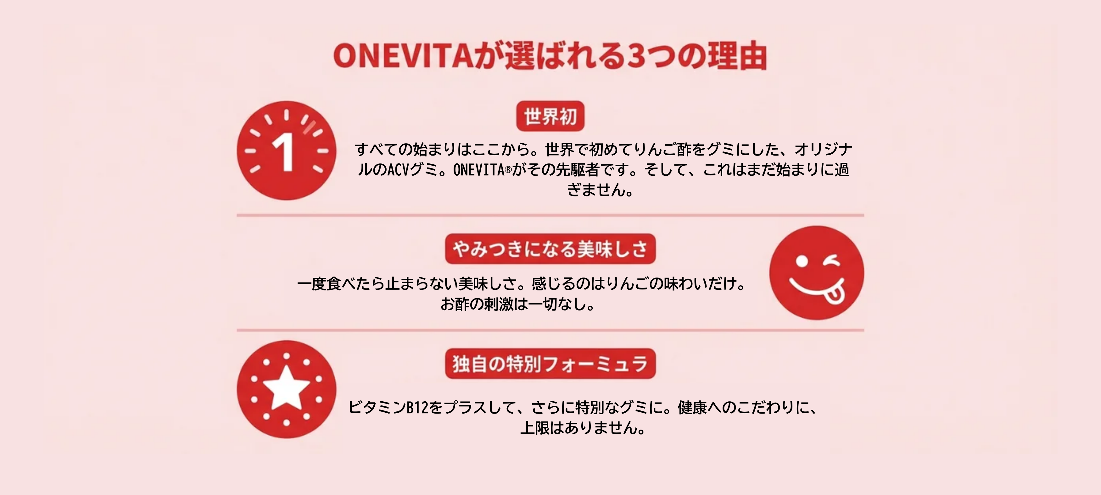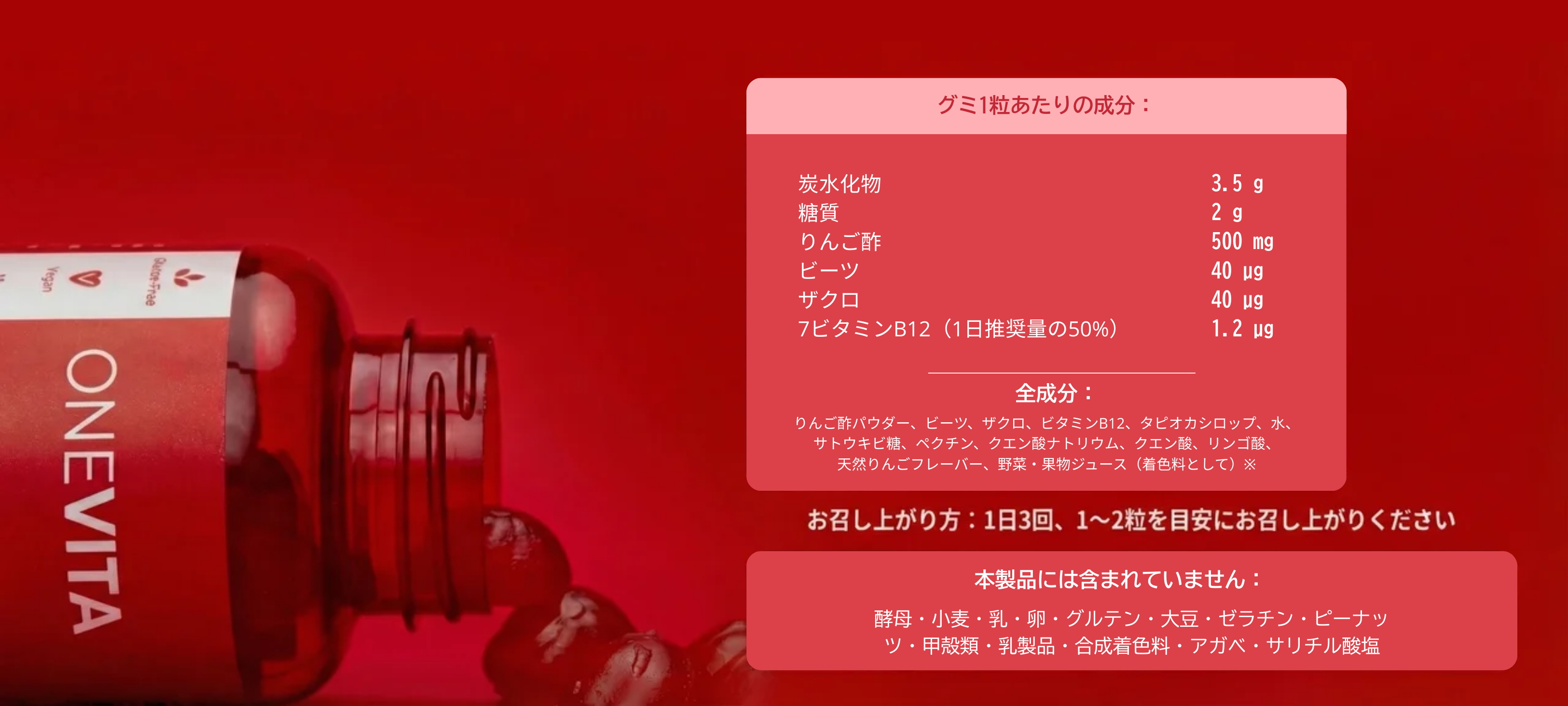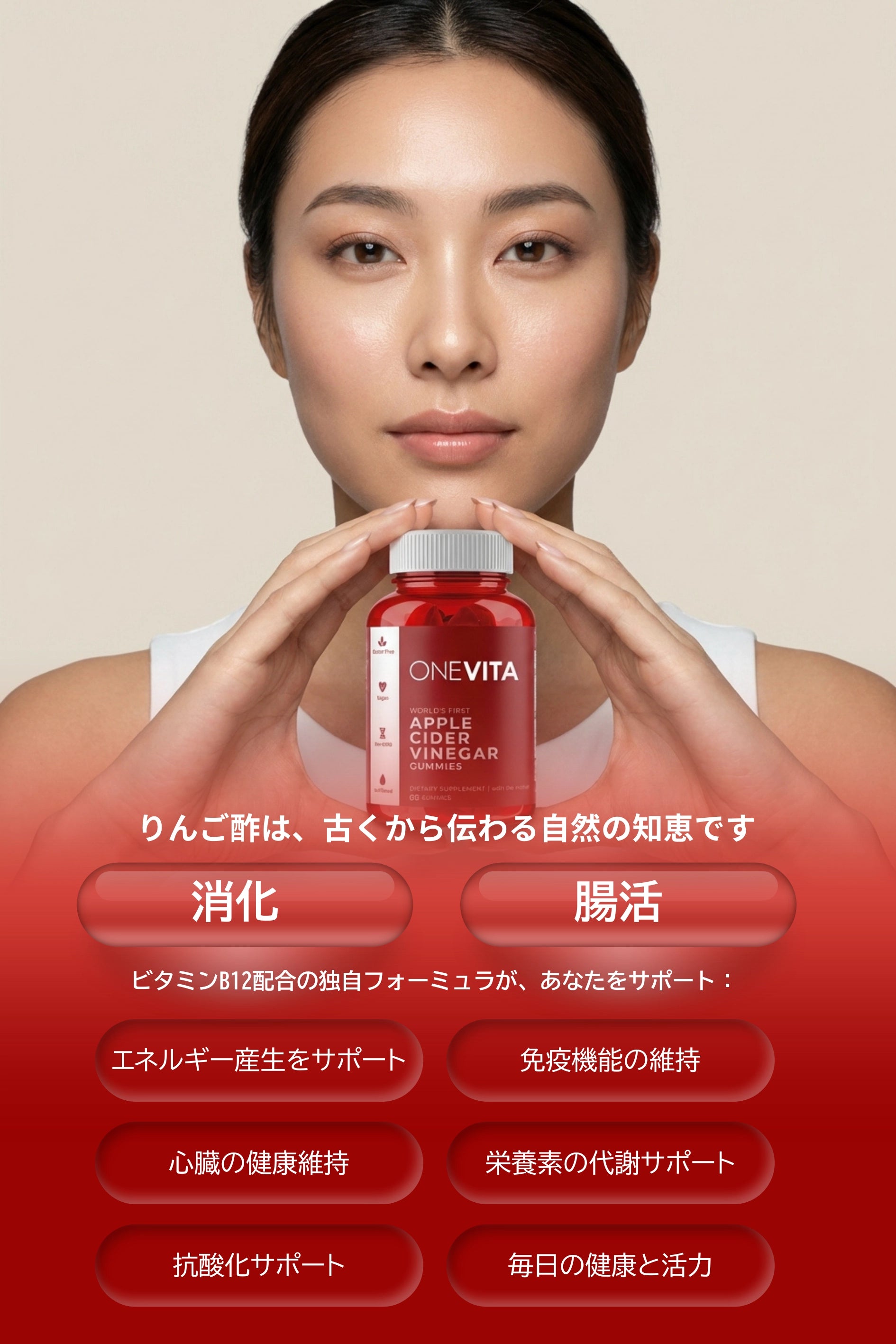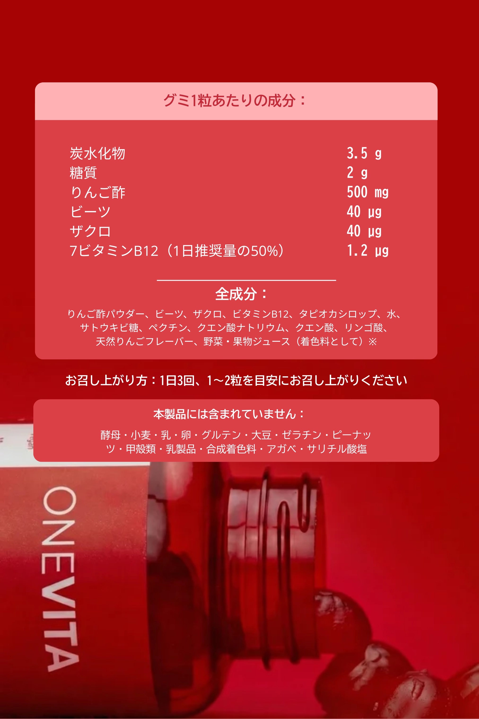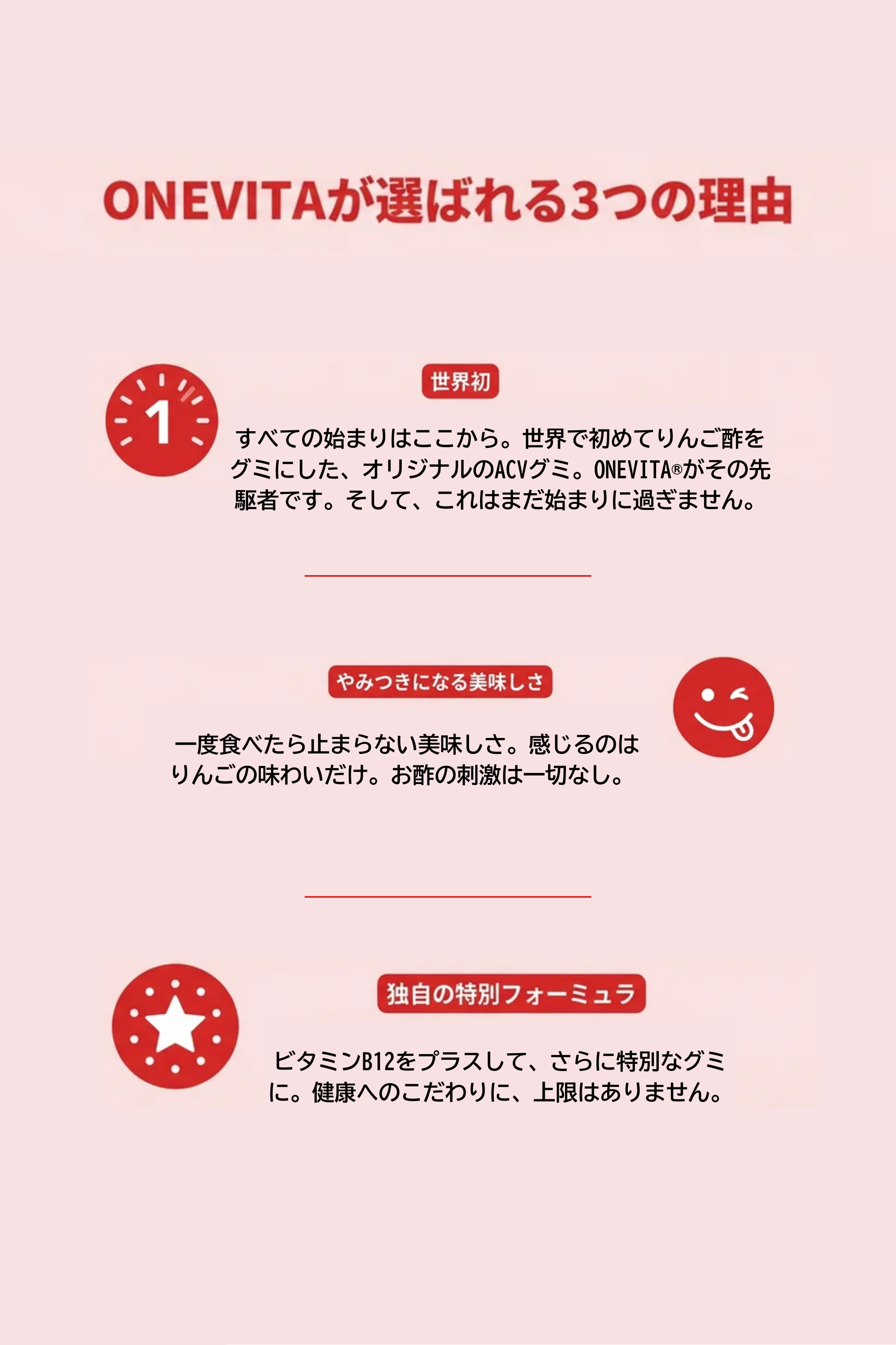 ONEVITA®りんご酢グミは、数多くの素晴らしい効果をサポートする独自ブレンドの素材で作られています。ビタミンB12を配合した特別フォーミュラで、エネルギー代謝・免疫機能・心臓の健康・栄養素の代謝・神経系の健康・毎日の健康と活力・抗酸化サポートを総合的にサポートします。